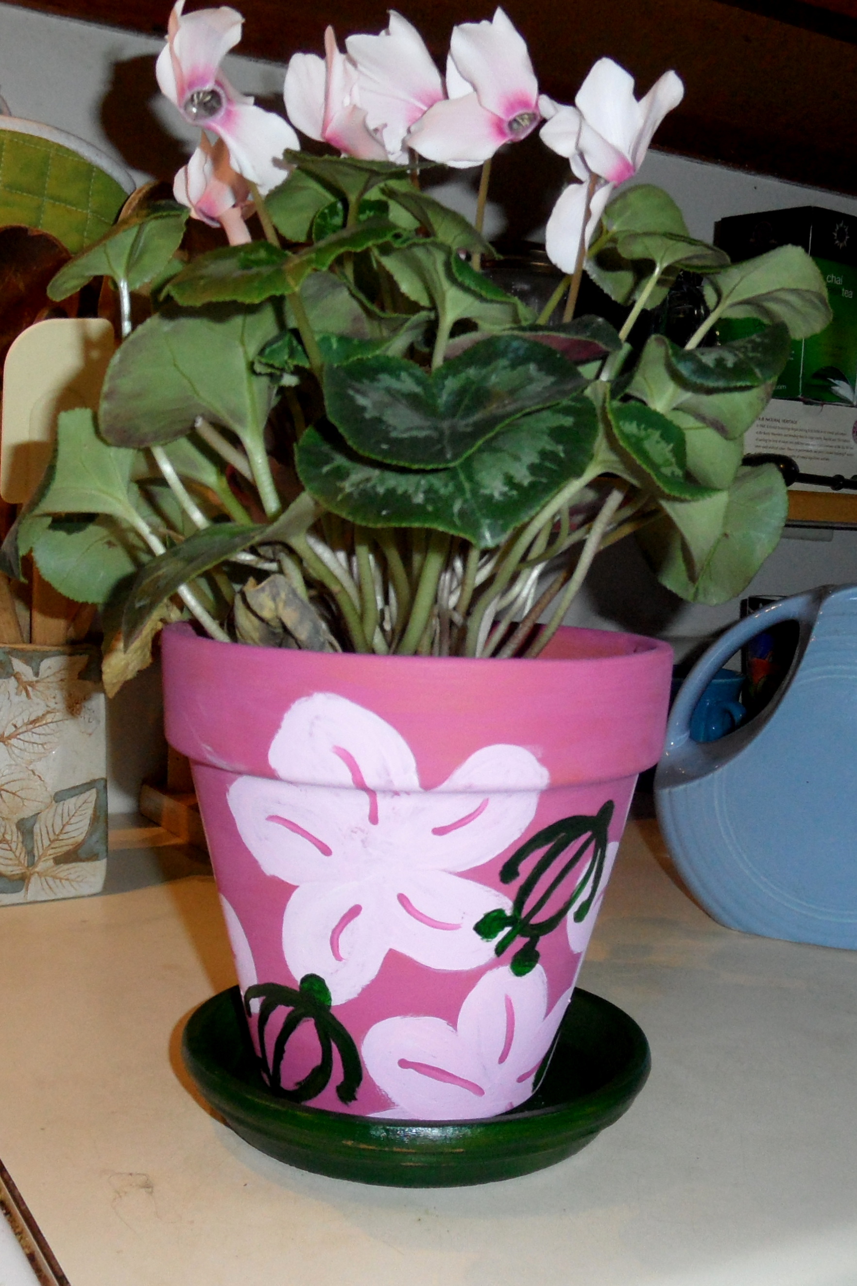 Because of being unable to draw I never let myself get into painting even thought I really wanted to, until last year when I took one of those byob painting classes (I went to dip n’ dab in atlanta). I figured since it was going to be mostly tipsy people who were just doing it for a laugh and since all the supplies were provided there was no harm in it, and minimal cost. I had fun. Now I am painting from time to time and I enjoy it. I like the way my paintings look, and I don’t judge them nearly as much as I thought I would. I paint some on canvas but the last few weeks I have been painting on terra cotta pots. I had done that before, but more like paint then a single pretty color or use a stencil. The few I did try to paint more on I was to nervous and they did not come out well.